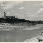 Widok z lewego, zachodniego brzegu Warty na brzeg wschodni na wysokości Rataj, po lewej fragment mostu Marchlewskiego (dzisiaj Królowej Jadwigi)08.1960