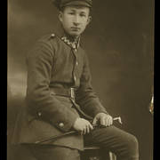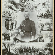Kompozycja fotograficzna na pamiątkę służby wojskowej przedstawiająca Józefa Idziora w mundurze garnizonowym strzeleckim armii niemieckiej z początku XX wieku, widoczny sznur strzelecki1914