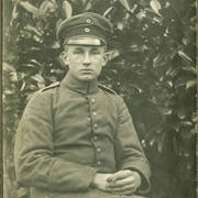Odwrocie pamiątki ze służby wojskowej przedstawiającej Józefa Idziora w mundurze garnizonowym strzeleckim armii niemieckiej z początku XX wieku, widoczny sznur strzelecki1914