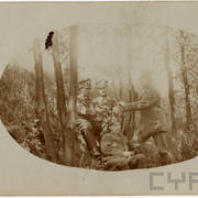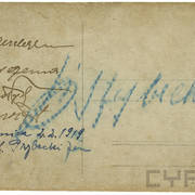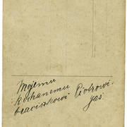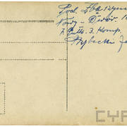 Odwrocie drugiego egzemplarza tej samej fotografii CYRYL_100_17_1_0002_1 z życzeniami „Serdeczne życzenia Wesołych Świąt. Łomnica 2.2.19. Plut. Przybecki Jan”03.1919–04.1919
