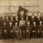 Fotografia pamiątkowa ze spotkania uczestników powstania wielkopolskiego z terenów Sadek i Nakła nad Notecią (prawdopodobnie) z lat 20. lub 30. XX wieku, Józef Witkowski stoi w środkowym rzędzie trzeci od lewej1920–1939