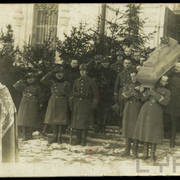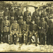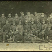 Żołnierze Landsturmu, jednostki składającej się z żołnierzy zaawansowanych wiekiem (po 40. roku życia), pełniącej funkcje pomocnicze w czasie I wojny światowej, w drugim rzędzie, szósty z lewej Marcin Grzybek