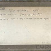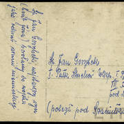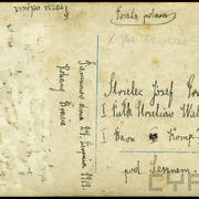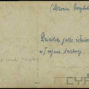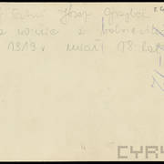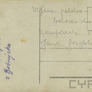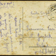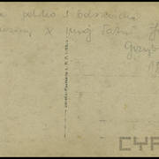 Odwrocie pocztówki ze zdjęciem żołnierzy 1. Pułku Strzelców Wielkopolskich na froncie litewsko-białoruskim w czasie wojny polsko-bolszewickiej, w pierwszym rzędzie, pierwszy z prawej siedzi Jan Grzybek, brat Józefa1919