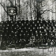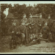 Pocztówka ze zdjęciem żołnierzy 1. Pułku Strzelców Wielkopolskich na froncie litewsko-białoruskim w czasie wojny polsko-bolszewickiej, w pierwszym rzędzie, pierwszy z prawej siedzi Jan Grzybek, brat Józefa1919