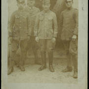 Żołnierze niemieccy, w środku żołnierz najwyższy szarżą odznaczony Krzyżem Żelaznym II klasy (wstążka Krzyża Żelaznego przepleciona przez dziurkę od guzika kurtki mundurowej), z widocznym sznurem strzeleckim, okres I wojny światowej