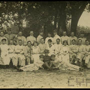 Pacjenci i personel szpitala wojskowego w Ostrowie Wielkopolskim, Jan Hojan (siedzi pierwszy z lewej) był pacjentem szpitala raniony w czasie jednej z potyczek17.07.1919