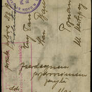 Odwrocie pocztówki przedstawiającej żołnierzy w mundurach niemieckich, Jan Hojan oznaczony krzyżykiem i literą H. oraz jego kolega, również oznaczony krzyżykiem, Franciszek Ciesielski1916