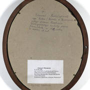 Fotografia portretowa Edmunda Mikołajczaka w mundurze niemieckim w owalnej, drewnianej ramie za szkłem, na fotografii na tle czarnej wstęgi przymocowany Krzyż Walecznych