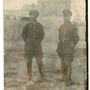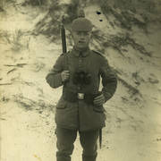 Odwrocie kartky pocztowej, którą Piotr Cegłowski adresował do swojego brata Antoniego powstańca wielkopolskiego, na zdjęciu Piotr Cegłowski w mundurze artylerii wojsk niemieckich ma niewidoczne (zdrapane) oznaczenia pułkowe