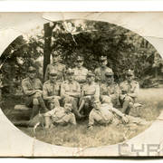 Józef Różewski (siedzi trzeci z prawej) z grupą żołnierzy nieznanej formacji w letnich mundurach (być może amerykańskie bluzy z okresu wojny polsko-bolszewickiej), fotografia prawdopodobnie z lat 20. XX wieku