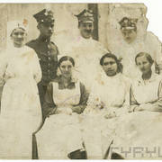 Zygmunt Miklaszewski (drugi z prawej) w mundurze wojsk wielkopolskich na tle stacji dentystycznej w Sławucie (obecnie Ukraina) w czasie wojny polsko-bolszewickiej04.04.1920