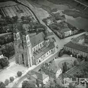 Katedra i pałac arcybiskupi na Ostrowie Tumskim z lotu ptaka, po prawej fragment rozebranego w 1970 roku mostu Cybińskiego