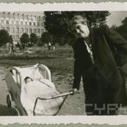Jadwiga Szymkowiak z wnuczką Małgorzatą Czarkowską na terenie dawnej Pewuki, w tle wystawowy Pałac Rządowy, dzisiaj Collegium Chemicum