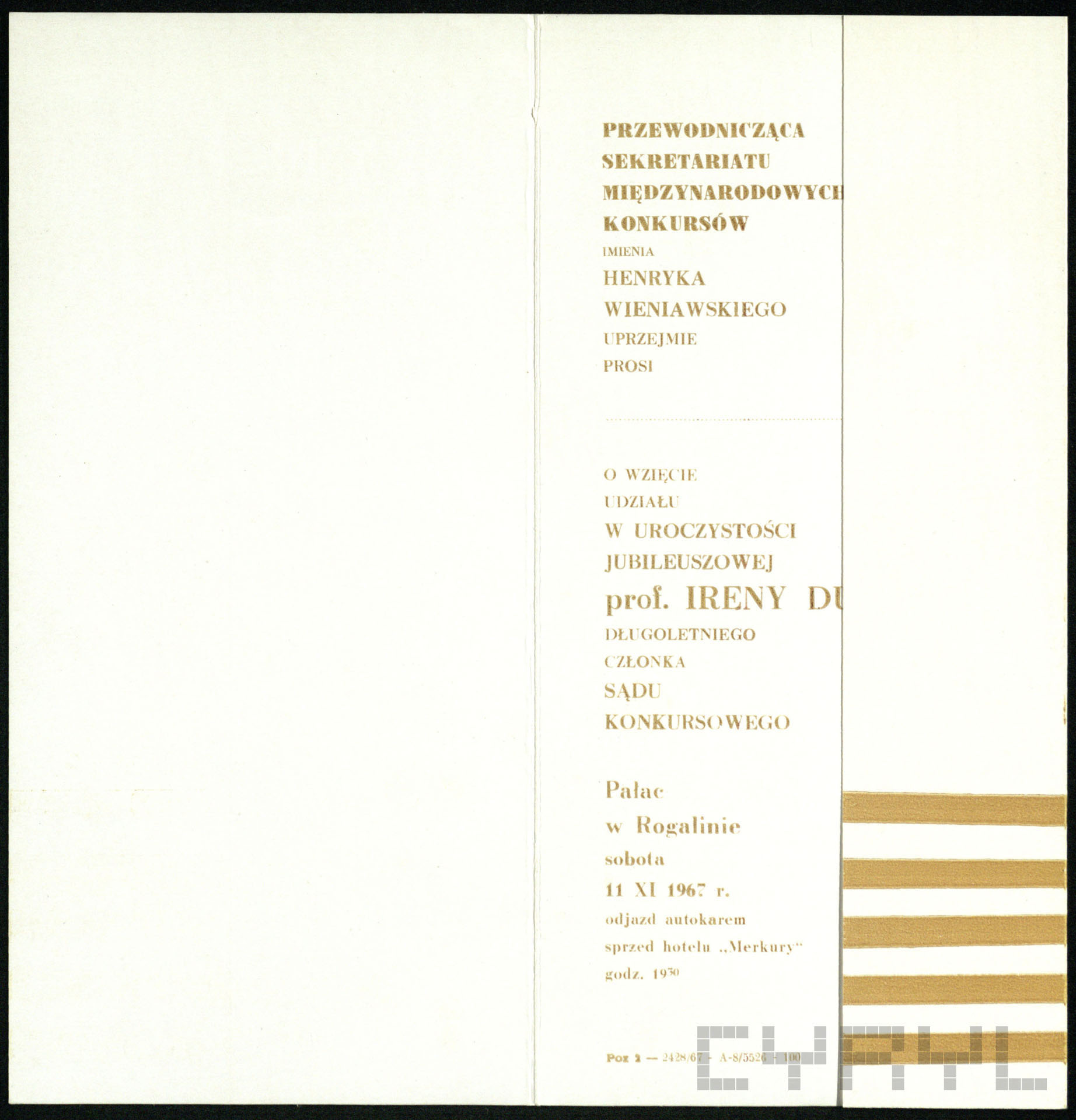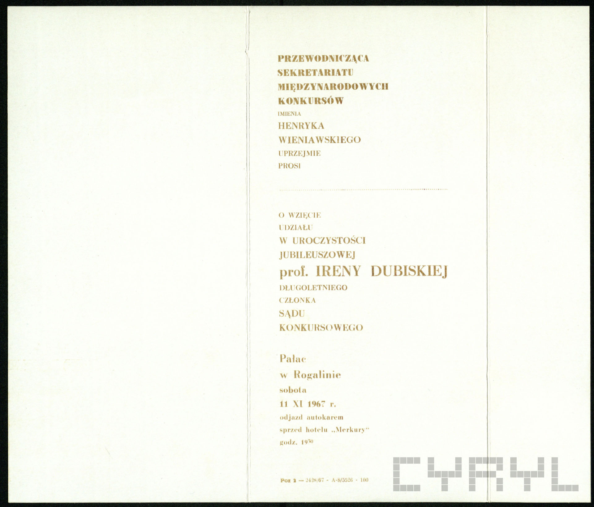 Zaproszenie na uroczystość jubileuszu prof. Ireny Dubiskiej, długoletniego członka jury Międzynarodowych Konkursów Skrzypcowych im. H. Wieniawskiego, w pałacu w Rogalinie11.11.1967