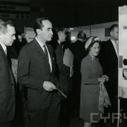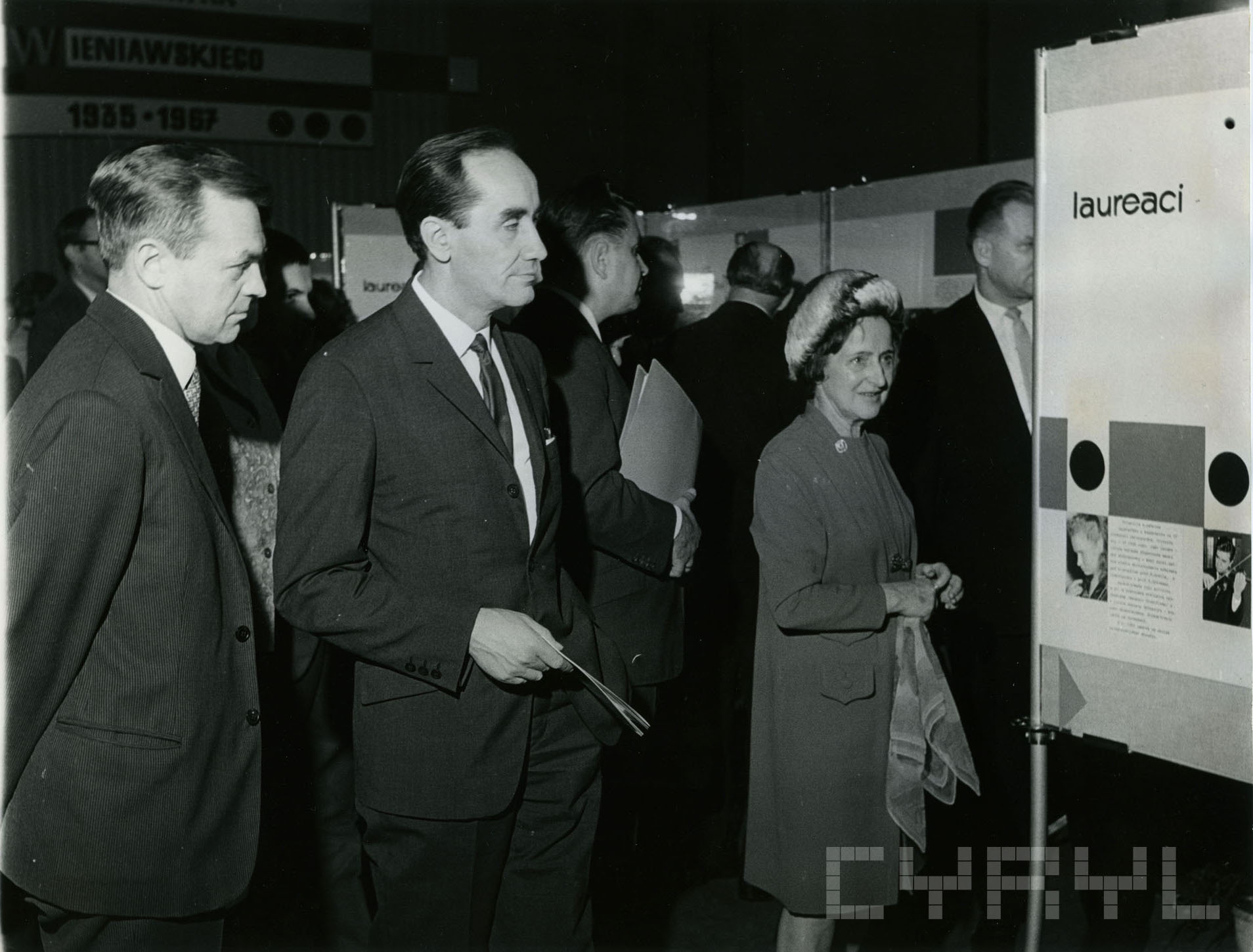 Kierownik Wydziału Propagandy KW PZPR Zbigniew Pawlak (z lewej), kierownik Wydziału Kultury KC PZPR Wincenty Kraśko i prof. Irena Dubiska na otwarciu wystawy Międzynarodowe Konkursy im. Henryka Wieniawskiego 1935-1967 w Pałacu Kultury