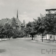 Ulica Bohaterów (dzisiaj Dowbora Muśnickiego) z dawnym szpitalem dziecięcym (z wieżyczką; dzisiaj Collegium św. Marii Magdaleny Uniwersytetu Medycznego)07.1962